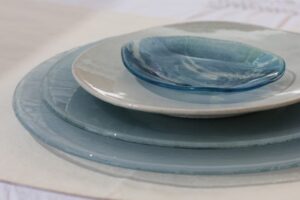 De proporciones generosas, se compone de dos medidas de platos, un bajoplato, un plato sopero y un bol de postre. Está realizada en color blanco, azul porcelana y aguamarina y puede combinarse de forma monocromática o mezclando los colores.