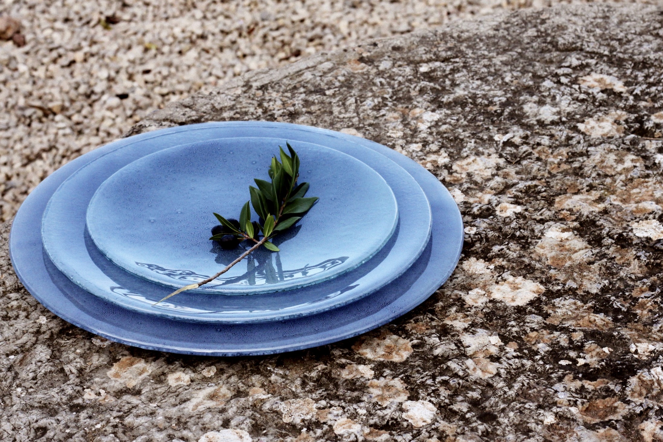 Realizado en vidrio flotado en doble capa con esmalte y aguada en azul cobalto. Cada plato es único en el motivo y en la “ola”